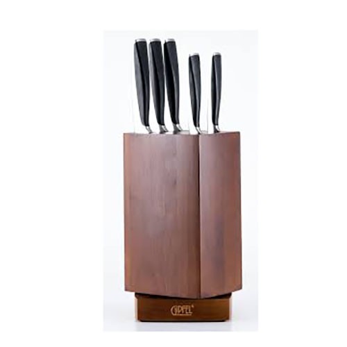 მზარეულის დანა 20 სმ, დანა 20 სმ, დანა პურის დაჭრისთვის 20 სმ, უნივერსალური დანა 13 სმ, დანა ბოსტნეულის დასუფთავებისთვის 9 სმ, ხის სადგამი).
