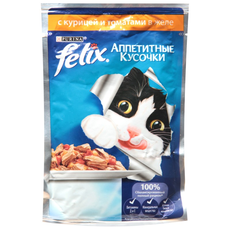 "FELIX" სრული დაბალანსებული საკვები ჟელე ქათმით და პომიდვრით 85 გრ, საჭმელი ფორმულირებულია მაღალი ხარისხის ინგრედიენტებისგან