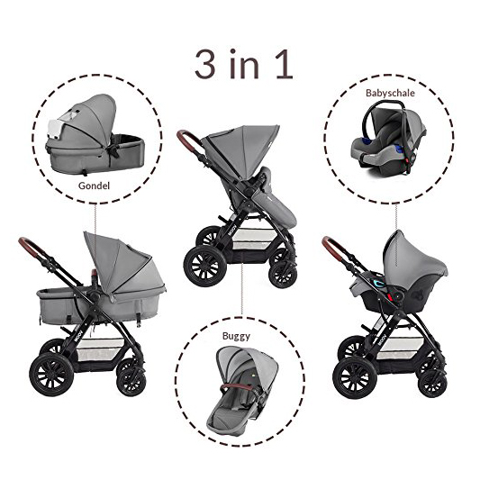 აღწერილობა: ალუმინის ჩარჩო, რეზინის საბურავები, ორმაგი სისტემის მქონე ამორტიზირებით და ცენტრალური სამუხრუჭე სისტემით. წინა ბორბლები 360 გრადუსზე ბრუნვადი და ფიქსირებადი, მშობლისთვის განკუთვნილი სახელური რეგულირებადი, ფართო ზომის გონდოლა რწევის ფუნქციით, საზურგის რეგულირების სისტემით.